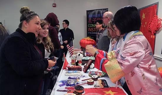 特拉华大学孔子学院展示的书画、服饰、茶艺、民间手工艺品、中文教学书籍等中国文化元素,引来大批观众驻足、询问。