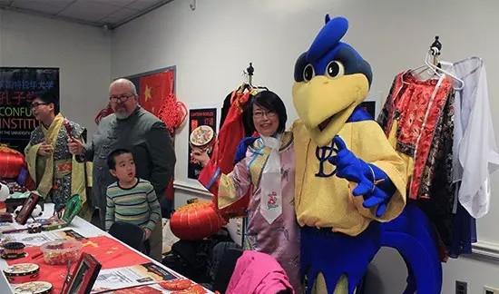 这是特拉华大学孔子学院第三次参加特拉华地区的“万国节”活动,得到特拉华大学各部门的重视。英语语言学院专门指派两名教师和几位学生全程协助展位宣传,特拉华大学的吉祥物“蓝雄鸡”也来到中国展位。孔子学院教师还接受了特拉华学生电视台专访。